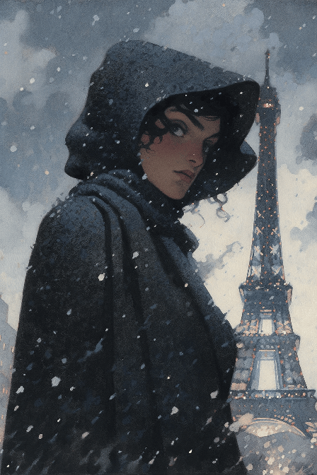 A charming Parisian woman stands under a light drizzle, the Eiffel Tower a soft silhouette in the background. Her face, full of poise and sophistication, is caught in a close-up shot. Borrowing elements from the post-impressionistic style of Carlo Crivelli, the scene is set against the backdrop of a typical Parisian street. UHD, 8K, intricate details, by A. J. Casson --ar 2:3 --s 400 --niji 5