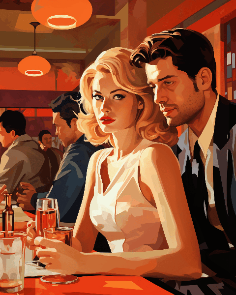 A young girl in a diner with people sleeping on the tables. And leaning on a handsome guy’s shoulder, There are bottles of alcohol where. by Josh Agle --ar 4:5 --s 250 --style raw --v 6.0