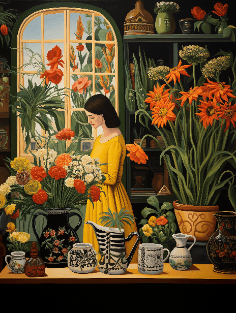 beautiful woman visiting flower shop, by Catherine Nolin --ar 3:4 --s 250 --v 6.0