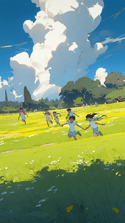 In anime style, children run through a springtime field, kites soaring high. Wide-angle shot captures the freedom of the moment. The environment is a flower-filled meadow under a clear, blue sky. Artist: Andreas Gursky --ar 9:16 --style expressive --s 400 --niji 5
