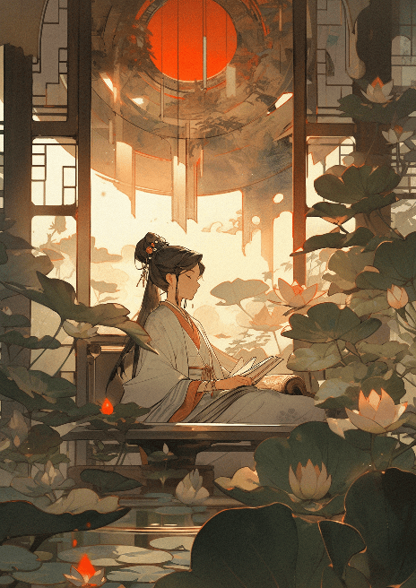 A narrative of tranquility unfolds in an anime style. The centerpiece is a serene young girl, her face mirroring the peace of a still pond, shown in a low angle view. She's engrossed in a captivating book of Chinese legends in a minimalist, contemporary library. The setting sun cascades over her, creating a golden glow around her figure. Emphasize the ultra details and enrich the scene with a pile of ancient scrolls, a cup of steaming green tea, and blossoming indoor plants. Render this in the meticulous visual language of Akos Major --ar 5:7 --s 180 --v 6.0