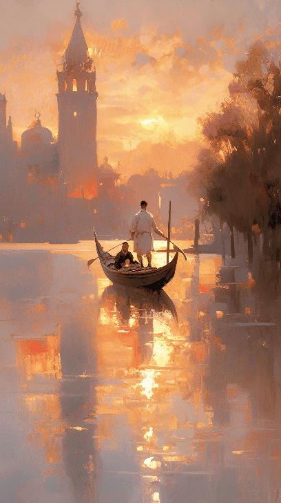 A romantic scene of a Venetian gondolier singing to a couple under the setting sun, rendered in the Impressionistic style of Claude Monet. Capture the gondolier's profile, highlighting his emotive expressions. Set against the backdrop of the enchanting Venice canals. Rendered in UHD capturing the golden hour glow. --ar 9:16 --s 180 --v 6.0