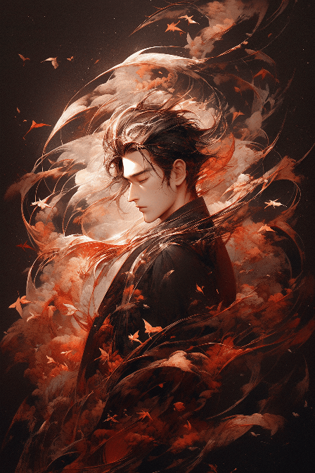 A dynamic, half body shot of a fashion-forward man in a minimalist style, walking with confidence through a wind tunnel. The environment is filled with swirling colors, an explosion of autumn leaves, by Zhang Jingna. Main elements: his dynamic pose and the swirling leaves around him. --ar 2:3 --s 180 --v 6.0