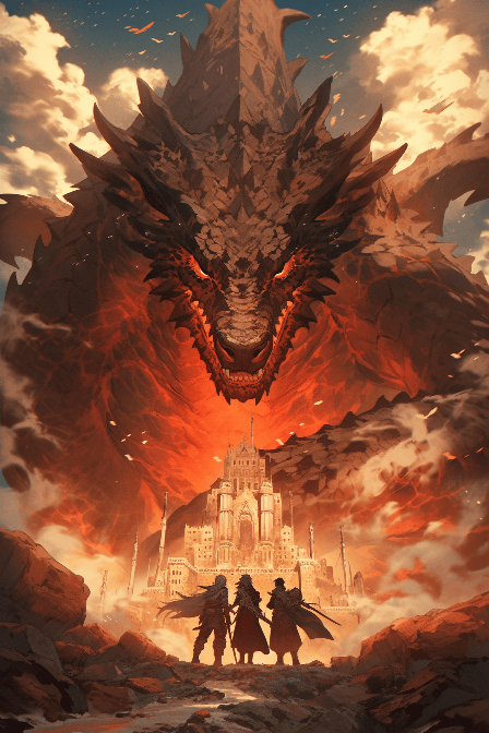 A trio of warriors in anime style, their faces etched with determination, stand defiantly before a gargantuan, fiery dragon. Perspective: Wide Angle. Composition: Pyramid formation of the trio. Environment: Crumbling castle on a cliff. Main Elements: trio, dragon. Auxiliary elements: castle, cliff. UHD, Ultra details, Art by Akos Major --ar 2:3 --s 180 --v 6.0