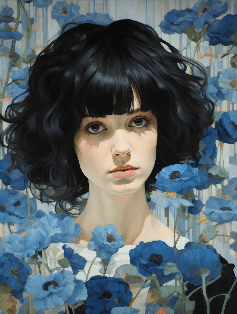 Beautiful woman with a bouquet of dark blue and dark teal poppies, by Gustav Klimt conrad roset hope gangloff, 32k sharp clear --ar 3:4 --s 250 --style raw --v 6.0