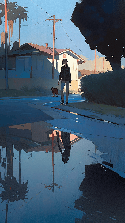Picture a quiet street at night in the style of Jeff Wall. A woman walks her dog, casting a long shadow that morphs into a playful, shadowy beast. Wide-angle perspective, capturing the magical realism of the scene --ar 9:16 --style expressive --s 400 --niji 5