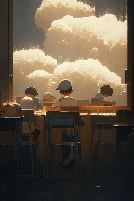 A school classroom in the style of Fan Ho. A child at a desk opens a textbook, from which a miniature rain cloud emerges, raining on the desk. Close-up view, capturing the magical moment and the child's delight --ar 2:3 --style expressive --s 400 --niji 5