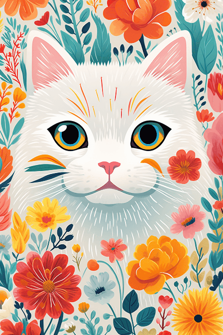 white cat garden book by an illustrator made by hermenia, in the style of colorful animations, vintage aesthetics, cute and dreamy, iberê camargo, playful brushstrokes, emmanuelle moureaux, cute and colorful --ar 2:3 --s 250 --style raw --v 6.0