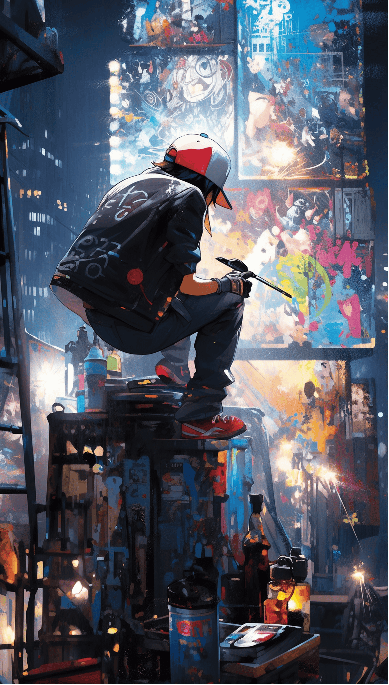 A graffiti artist at work, his spray can transforming a city wall into a vibrant canvas. Rendered in the style of Karen Knorr, the extreme close-up captures the intense focus in his eyes, his art a splash of color in the city night --ar 9:16 --s 400 --niji 5