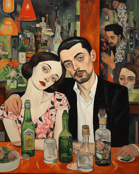 A young girl in a diner with people sleeping on the tables. And leaning on a handsome guy’s shoulder, There are bottles of alcohol where. by Catherine Nolin --ar 4:5 --s 250 --style raw --v 6.0