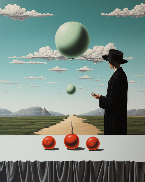 Delve into the mind of surrealist artist René Magritte as you encounter a close-up perspective of a thought-provoking masterpiece. In this asymmetrical composition, witness a bowler-hatted figure with a floating apple obscuring their face, challenging the boundaries of reality and perception --ar 4:5 --s 250 --style raw --v 6.0