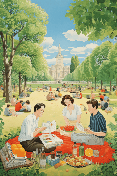 Picnic in Regents park with book lovers talking with each other surrounded by books, fresh lemonade cheese and berries, by Herge, --ar 2:3 --v 6.0