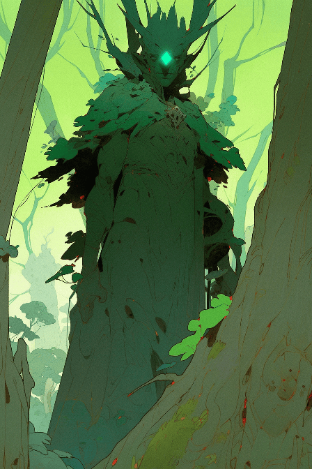 Imagine an anime style, a forest spirit with emerald eyes and a crown of leaves stands amidst the ancient trees. Profile shot highlights the spirit's striking features. The environment is a lush forest at dawn. Artist: Alex Webb --ar 2:3 --style expressive --s 400 --niji 5