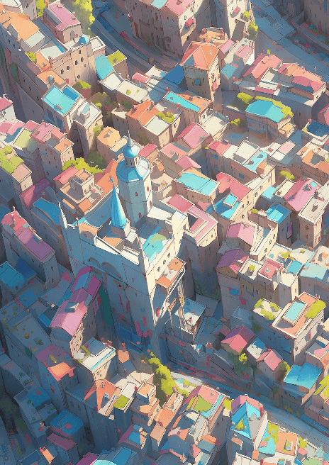 In the style of anime, we witness a surreal dream. A character with ethereal wings soars above a city made of candy. Perspective: bird's-eye view. The composition is beautifully balanced, capturing the vast, vibrant environment. UHD, 8K, fine details. Artwork by Akos Major --ar 5:7 --style expressive --s 400 --niji 5