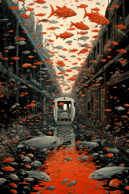 A train with many fish swimming in the middle of it, lo - fi aesthetics, tsutomu nihei, orange and emerald, sharp attention to detail, absurdist installations, solapunk, by Yuko Shimizu --ar 2:3 --v 6.0