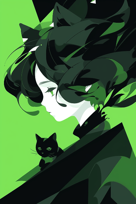dark green hair, black little cat, only light green as the background, the color matching is mainly green, white, black,flat illustration, geometric shapes, minimalism, vector illustration --ar 2:3 --s 180 --v 6.0