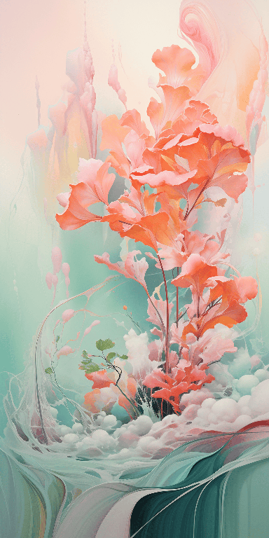 A surrealist landscape painting with flowing forms and dreamlike details, ink calligraphy canvas, gestural brushstrokes, color field techniques, and expressive mark - making, soft gray, pastel shades, pink, mint green, peach, spearmint blue, color scheme, inspired by the surrealist movement, partical effects, and dreamlike paintings --ar 1:2 --s 250 --style raw --v 6.0