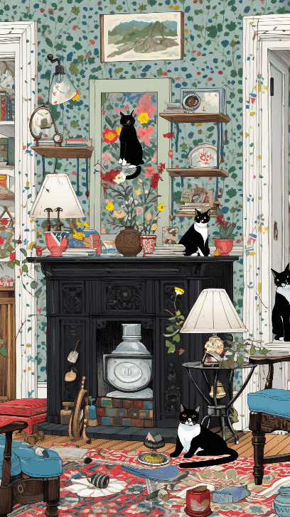 In the spirit of Alec Soth's style, imagine an endearing illustration of a mischievous cat engaged in a playful pursuit. The feline exhibits a range of dynamic motions, each capturing the essence of its playful nature. The background, an eclectic and colorful living room, filled with scattered toys, paper balls, and scratched furniture, is seen from a low angle view. Highlight the amusing and heartwarming details in an exquisite, minimalist style. --ar 9:16 --s 180 --v 6.0