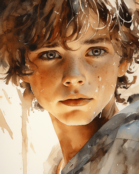 A watercolor illustration of a boy's face, close - up, super detail, beautiful light, --ar 4:5 --style raw --s 250 --v 6.0